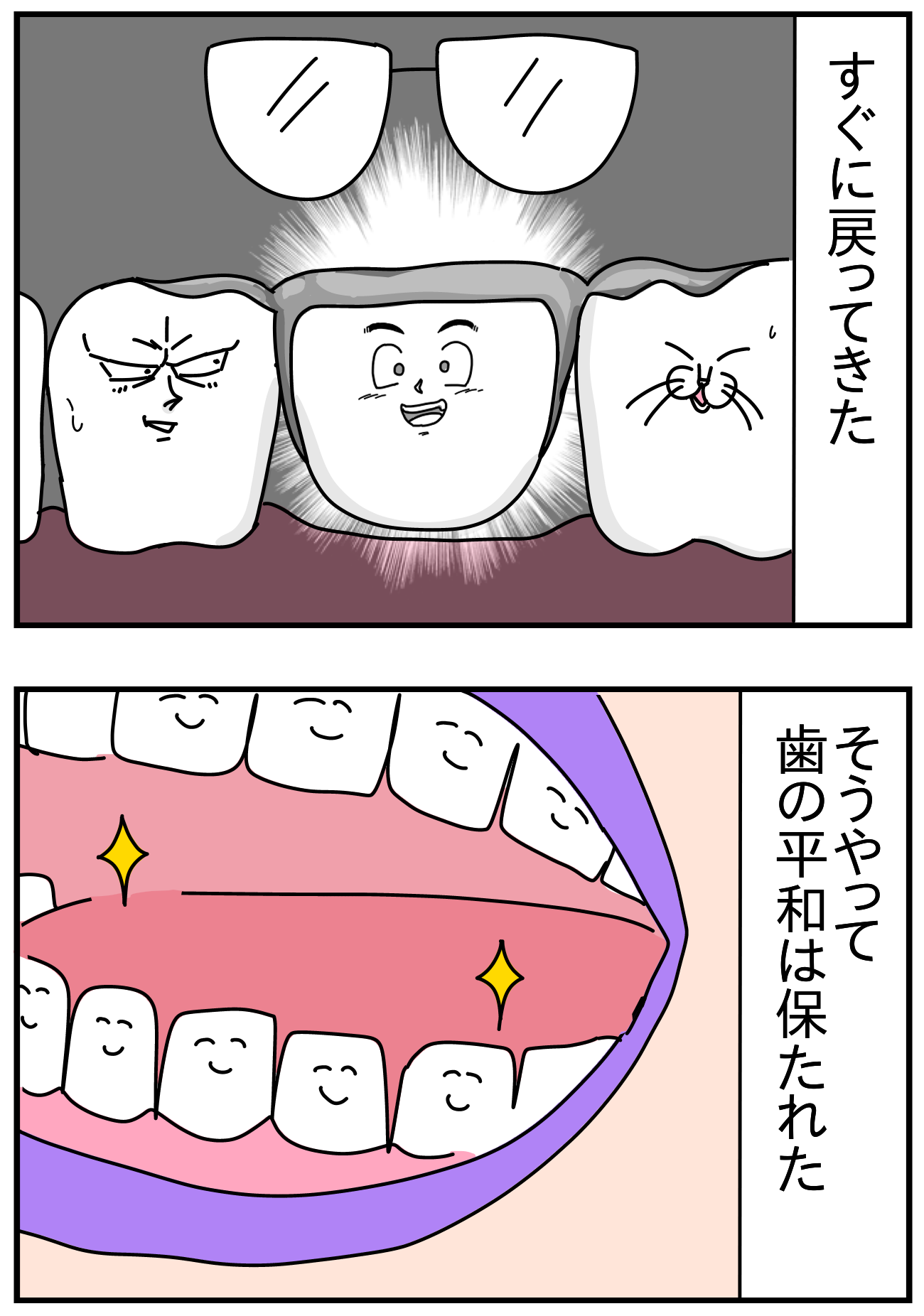 それぞれの歯の運命 2021年01月14日 前回の話▽ ブリッジ治療したつづくちなみにハイチュウは葡萄味です事故にあった話▽ 新車買った話▽ ============================コメントありがとうございます全て嬉しく読ませて頂いてます!============================▽書籍つんのいちぞく [単行本]つんKADOKAWA2020-02-14▽インスタ▽LINEスタンプ販売中です 「歯の話」カテゴリの最新記事 「日常」カテゴリの最新記事 タグ :#歯#ブリッジ#ナッパ < 前の記事次の記事 > コメント コメント一覧 (14) 1. ばばこ 2021年01月14日 20:20 ハイチュウはブドウ味ですじゃないのよ…笑笑 いつも楽しみにみています! 今日はつんさんのブログ見返してて1日終わりました! 寝たくないムギを二日に一回は聴いて癒されています! これからも応援してます!! がんばってください〜! 2. !? 2021年01月14日 20:27 以前と別の事故です!?同じ事故です!?(混乱 つんさんオダイジニ…! 3. つん 2021年01月14日 20:45 >>2 リンクに貼ってる以前の事故です 今は元気です^^ 4. みやび 2021年01月14日 20:52 ナッパよけろーーー! (つんさんのナッパは避けれてないw つんさんのナッパてwww 自分で言って笑ってもうたw 5. はなこ 2021年01月14日 21:03 ナッパはどこの歯なんだぁー! 悟空の向かって左は最初ベジータだと思ってたけど、よく見たらピッコロさんだぁ.. ゴメンねピッコロさん..(´`) 歯シリーズ好きですぅ😌♥笑 6. すいれん 2021年01月14日 21:57 めちゃめちゃ笑いました!! 私は歯科衛生士なのですが、こういうおもしろいマンガならみなさんに歯に関心持ってもらえそうだなぁと思いました (^∇^) スーパーフロス、がんばってください♡ というか、つんさん歯に衝撃あるほどの事故とか大変でしたね(/ _ ; ) 7. うめ吉 2021年01月14日 22:03 事故…思い出すとつら( ᵕ̩̩ㅅᵕ̩̩ )大変でしたね( ᵕ̩̩ㅅᵕ̩̩ ) 悟〇だけ伏字なのはなぜなのか…w 8. わさび 2021年01月14日 23:14 事故にあった時の話読み返したら、確かにナッパ(欠けた歯のカケラ)持ってますね…!涙 9. あべ 2021年01月14日 23:15 ハイチュウ(笑) ブリッジとれちゃうなんて、ハイチュウって強いんですね。 歯が折れてしまうほどの事故の衝撃に言葉がありません…つんさん大変だったろうな… 10. 俺はヒロシ派 2021年01月15日 06:26 つんさんのこの目の死んだ悟空がほんとに好き...笑 11. ももっい 2021年01月15日 12:05 もうやめて!つんさんの歯は体力は0よ!!! 12. あのごんママ 2021年01月15日 13:20 ブドウ味笑いました😂 ちなみに私はハリボーグミで詰め物取れたことあります! グミだけどあいつは危険です…お気をつけ下さい! 歯が欠けるほどの衝撃…! 大変な事故でしたね😭 今つんさんが無事で元気でいてくれて良かったです✨ 13. 名無 2021年01月15日 17:45 もう自分の歯の事のように辛い。 14. ☆はるママ☆ 2021年01月16日 10:59 はいッ( ´ ▽ ` )ノ 私も同じ経験あります❗️ ハイチュウとミルキーで銀歯取れましたw 先生に何故取れた?と聞かれ… 『娘のお菓子食べた(照)』と答え爆笑されました(//∇//) ハイチュウとミルキーは噛んじゃダメ‼️ 飴のように舐めないと危険です笑 コメントフォーム 名前 コメント 評価する リセット リセット 顔 星 投稿する 情報を記憶