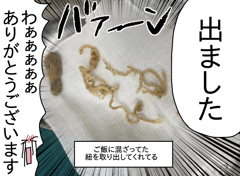 ジョルノ事件(再)⑩〜毛玉〜 2022年06月17日 ▽最初から ▽前回の話 吐かせる処置中待機すごく静かだったから会話も小さい声でそして出、出ーーーー!よかったぁぁぁぁ😭次回紐の詳細つづき⤵︎ジョルノ事件再⑪ ============================コメントありがとうございます全て嬉しく読ませて頂いてます!============================▽書籍つんのいちぞく [単行本]つんKADOKAWA2020-02-14▽インスタ▽楽天room▽LINEスタンプ販売中です カテゴリなしの他の記事 タグ :#ジョルノ#動物病院#夜間診療 < 前の記事次の記事 > コメント コメント一覧 (32) 1. かんら 2022年06月17日 20:20 わーん! ヒモ出てきて良かったですー😭😭😭💗 2. 小麦粉 2022年06月17日 20:21 紐出てよかったーーーーーーー! ジョルノよく頑張った。・゚・(*ノД`*)・゚・。 3. ゆかりん 2022年06月17日 20:21 いつも読んで拍手だけなのですが、コメントさせてもらいます。 ジョルノ吐いてくれて、ヒモも出て良かったー! 3回も止血剤がんばりましたね エライ!よー ホントに良かった! 4. ずんだもちこ 2022年06月17日 20:22 ジョルノーー! 良く頑張った! 良かったーー(><) 心配させやがって!☆ 5. わおこ 2022年06月17日 20:44 わーー、結構しっかり糸!!! 吐き出せてよかった😭 ジョルノがんばった…!おつかれさまです🐈⬛ 6. (*¯ω¯*) 2022年06月17日 20:50 うわーーーー!おめでとうございます(涙)お疲れ様でした😭😭😭😭😭😭 7. かっちょええ✨ 2022年06月17日 20:51 先生ぇぇぇ(感涙) ヽ(T∀Tヽ)💨💨 最初、 “なんか苦手かも…” とか思ってしまってごめんなさい💦 いまはハリウッドスター並みの 光輝くオーラを纏って見えます✨ 8. キキィ 2022年06月17日 20:53 本当に良かった!! モノマネめっちゃ気になります。 ジョルノのテヘヘの顔大好きです。 もしLINEのスタンプにしてもらえるなら押しまくります! 9. おまご 2022年06月17日 20:55 吐いてくれてよかったぁ!!! うちの猫も紐が大好きで、気をつけていたのにいつの間にかマスクの両紐食べられまして…うんちに絡まりながら全て出てきました笑 10. にゃまえ 2022年06月17日 21:00 紐も毛玉もちゃんと洗って絞ってあるっぽいですねw 11. あさひ 2022年06月17日 21:16 良かったね〜〜!! ジョルノも頑張ったけど、つんちゃんも頑張ったね!! 12. むすび 2022年06月17日 21:29 よかったー!ジョルノ頑張ったねえ〜!!! 13. ちー 2022年06月17日 21:37 あぁあー良かったぁ! 想像していたよりもだいぶ長い紐でビックリしました(°д°) 毛玉も出て良かった良かったε-(´∀`*) 14. おもち 2022年06月17日 21:39 無事とわかっていてもハラハラドキドキ、そして一安心🤮 15. よよぬこ 2022年06月17日 21:43 ぬまん に笑いました〜! 確かに吐く時ぬまん言ってるかも(笑) 16. ななし 2022年06月17日 21:58 先生お茶目!深夜に駆けつけてくれた飼い主さんを和ませようとしてるの凄い! 17. くろぶた 2022年06月17日 22:25 良かったー!良かったー! 自分の家の猫の事のように心配で、毎日記事が更新されるとすぐ見に来ていました。 ジョルノくん頑張ったね… 18. はつ。 2022年06月17日 22:41 めっちゃひもぉぉぉぉーーーー 出て本当に良かったね! 19. こんにゃく 2022年06月17日 22:41 出てきてよかった〜٩( 'ω' )و こういった場合、自然にウンチとして出てくるのを待つのと処置してもらうのどちらがいいのかしら。ネコさんのストレスや体へのダメージを考えると悩ましい選択です。。つんさんとネネさんの優しさには合掌🙏 25. ななし 2022年06月18日 06:15 >>19 私も普通にぬんちで出てくるほうがよいのではと思いました☺️ねこのほうも食べたらしぬやつは、本能的にわかるのではと、素人目線ですが 32. サワガニしか飼ったことないけど 2022年06月18日 21:15 >>19 下にコメントされている方が腸閉塞にもなるとおっしゃってるので、病院でプロに診察してもらうのが一番適切なのかもしれないですね〜 20. えだまめ 2022年06月17日 23:12 ぎえぇぇぇーっ!!!思ってたより凄いのでびっくり。みんなみんな頑張った! 21. ちろる 2022年06月17日 23:19 わーーーー!!!!ヒモ上手く吐き出せてよかったです!!!!!うちは同じく夜中にヒモを飲んでしまって、朝病院行ったら腸閉塞で開腹手術になりました…ジョルノくん本当に良かった!!!! 22. つんさん大好き子 2022年06月18日 01:31 ジョルノぉぉぉぉよかった!!! よかったよ…!!! もうくちゃくちゃしたらダメだよ…!本当によかった…! 23. マカロニ 2022年06月18日 02:43 電子書籍からハマってブログに辿り着きました。ジョルノ〜よかったねぇ〜!いい家族を持ったね〜!ほんとによかった〜! 24. 背脂大魔神 2022年06月18日 04:54 うおおおおよかったーーー! 頑張ったえらい!!! 26. ぽんこつぽんこ 2022年06月18日 07:22 ジョルノもつんさんもネネさんもお疲れ様でした…毛玉もこんにちわ… 27. ぶじ 2022年06月18日 07:23 わーん!良かった〜! ほんとけっこう飲んでたんですね… ジョルノもつんさんねねさんも、先生も、みんな偉い! 28. みしゅか 2022年06月18日 16:10 結構長くてビックリ! でも無事に出てきて良かった!そして毛玉でけー 全部出てジョルノもスッキ