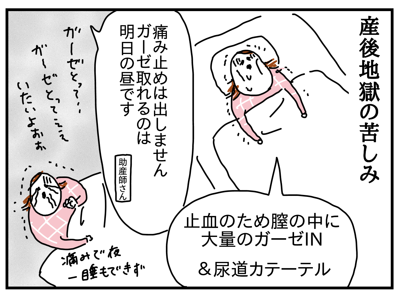 私は前置胎盤だったので帝王切開→ガーゼ詰め込み止血だったのですが、取るときはタオルを噛んで叫び声を押し殺しました(笑)いや叫んでたけど。