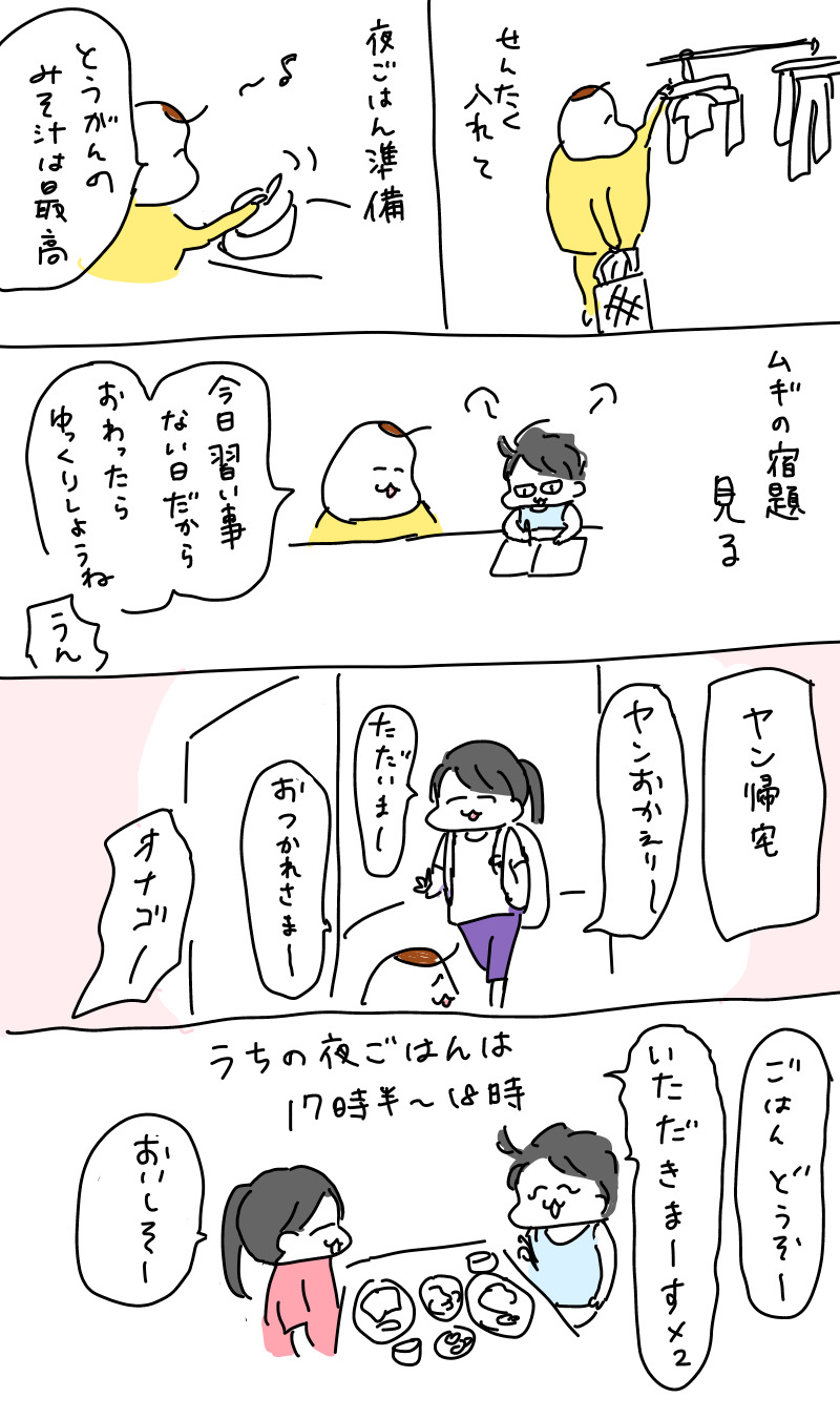 夕ご飯が早めで尊敬します。ウチ(リクくん位です)はあんまり早く出すと残される上に、21時ごろ歯磨きして寝かせようとすると「お腹空いた」と言われます…。