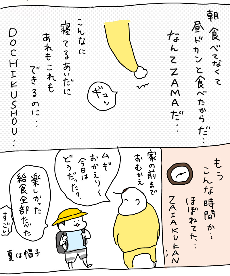 寝る前にお腹すいたかもという話になると「なら早く寝て明日の朝いっぱい食べよ!」で今のところいけてます!😅