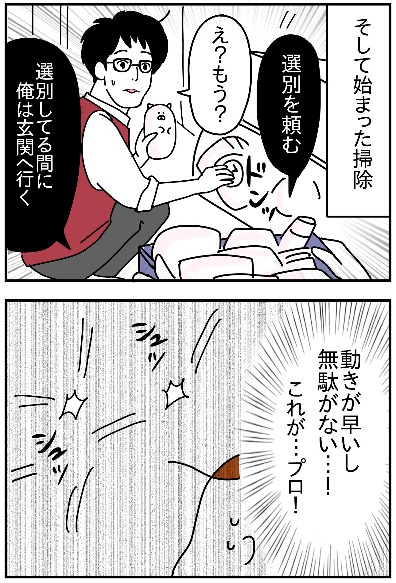 脱魔窟・断捨離レポ④ 2025年04月19日 ▽前回の話 つづく!コメントおもろすぎやろ😂↓============================コメントありがとうございます全て嬉しく読ませて頂いてます============================▽読者登録▽無料Kindle▽書籍つんのいちぞく [単行本]つんKADOKAWA2020-02-14▽インスタ▽楽天room 「断捨離レポ」カテゴリの最新記事 タグ :#掃除#断捨離#魔窟 < 前の記事次の記事 > コメント コメント一覧 (9) 1. ことと 2025年04月19日 19:45 Spotifyで流しながらみました😂 コメント欄も最高です! つんさん頑張って! もう切られないワンピース!(私もある) 2. わたしの癒しです 2025年04月19日 20:21 つんさんの漫画も最高ならばコメントも極上w 笑いがストレス解消に一番よね。 つんさん、いつもありがとう! 3. コカ 2025年04月19日 22:21 となりのトトロのパパ! お弁当のシーンですね🤣 4. ハードパン 2025年04月19日 23:29 ワンピースシャンクスからの急にトトロ父(笑) 部屋が片付いてるってストレスフリーですよね! 王になれると良いですね! 5. やはりプロは素晴らしい 2025年04月20日 01:37 のですが、つんさんに質問です 片付け番組などを見ながらいつも思うのが、例えプロとはいえやはり他人 人に雑に触られたくないような大事なものが大量にある場合はどうするんだろう?と プロは仕事ですから時間内に済ませるスピードが優先なのかとは思いますが、だからといってものを雑に扱う人だと大事なものが傷がついたり、せっかく片付いても後から嫌な思いをしたりしないのかな?と… つんさんが依頼したシャンクスプロはそこらへんどうでしたか? 6. 犬好き仮面 2025年04月20日 15:03 買い取ってもらいつつ、私らの筋力体力ではなんともならないデカ家具を処分してほしいけどいざ見積もりをお願いする気力がわかない…。 四次元マンションの能力ほちい。 7. ぷりむ 2025年04月20日 17:25 私もこの漫画見ながら頑張ります😭 にしても、仕事早い…! 8. BB 2025年04月20日 20:06 やはり何かが違うのでしょうね。 ああ、今また自分ちのあちこちをあーすれば、こーすれば、、、と、頭の中でモヤモヤして来ました。 そして、めいちゃんのパパの「ええ?もお?」が脳内で聞こえました。 9. こひめ。 2025年04月24日 22:51 前回のコメント貼付されてるの、中身が秀逸すぎて声出して笑わせてもらいました😂 (もうきられない)に詰まったサイズアウト感w コメントフォーム 名前 コメント 評価する リセット リセット 顔 星 投稿する 情報を記憶