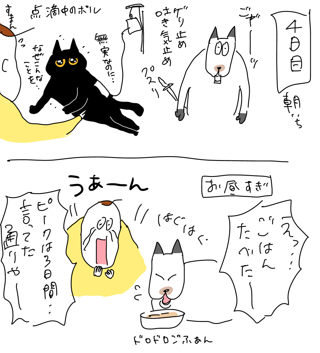 具合が悪い時は喋れたらいいのにな。ここが痛いよとかお薬飲んだら良くなるよとか言い合えたらいいのにな。ジョルノもポルちゃんも頑張ってエライ!ご家族みなさんもお疲れ様でした。